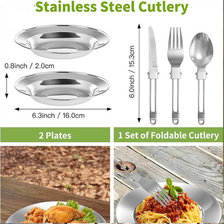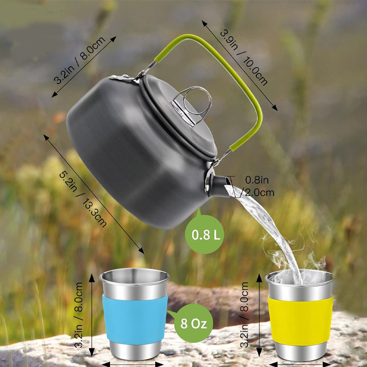 Este kit abrangente inclui tudo o que é necessário para refeições ao ar livre: tachos, panelas, chávenas, pratos, garfos, facas e colheres - proporcionando uma solução de cozinha completa para aventuras de campismo.