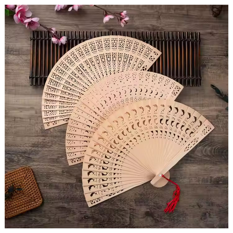 Habilmente feito de bambu natural, cada leque apresenta padrões de recortes intrincados e acabamentos suaves que evocam a elegância tradicional. Uma combinação perfeita de funcionalidade e estética, ideal para festas com temática vintage, casamentos ao ar livre ou eventos culturais.