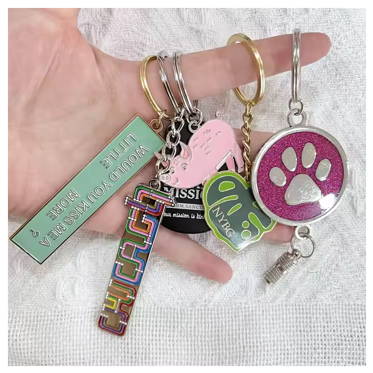 Criado a partir de metal de alta qualidade com um revestimento macio de esmalte que oferece cores vibrantes e textura tátil. A superfície em relevo acrescenta profundidade e dimensão, dando a cada chaveiro uma aparência premium.