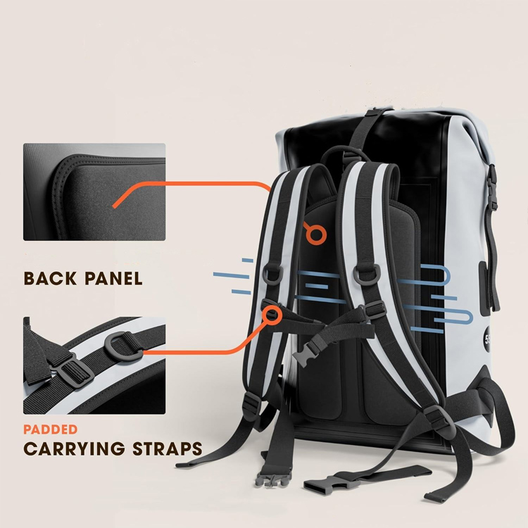 Inclui alça de ombro acolchoada confortável, várias alças de transporte e alças de compressão externas para fixação segura em mochilas ou embarcações durante movimentos ativos.