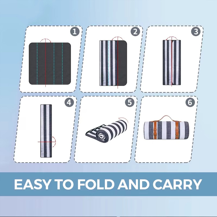 Cobertor dobrável listrado durável à prova d'água para piquenique. Seu principal companheiro ao ar livre para piqueniques e aventuras. Este tapete de piquenique direto da fábrica apresenta um design dobrável compacto com alça de transporte conveniente. Fabricado com tecido listrado durável à prova d'água, oferece opções de impressão personalizadas para clientes atacadistas.