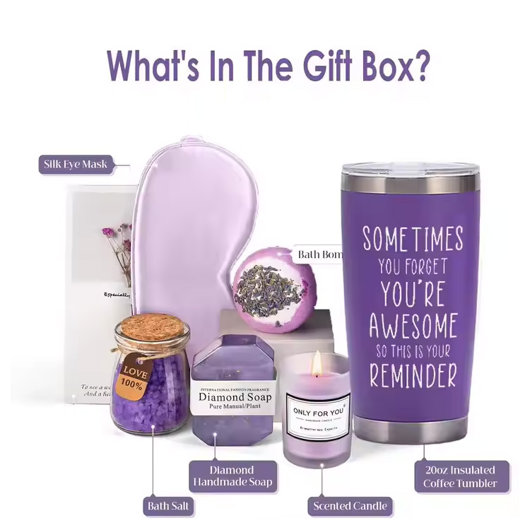Cada caixa de presente Lunaire inclui uma seleção lindamente coordenada de itens, como copo de aço inoxidável, vela de aromaterapia, sabonete em forma de diamante, flores secas e cartões comemorativos. Este conjunto pronto para presente economiza seu tempo e ao mesmo tempo proporciona uma experiência completa e sincera para qualquer ocasião.