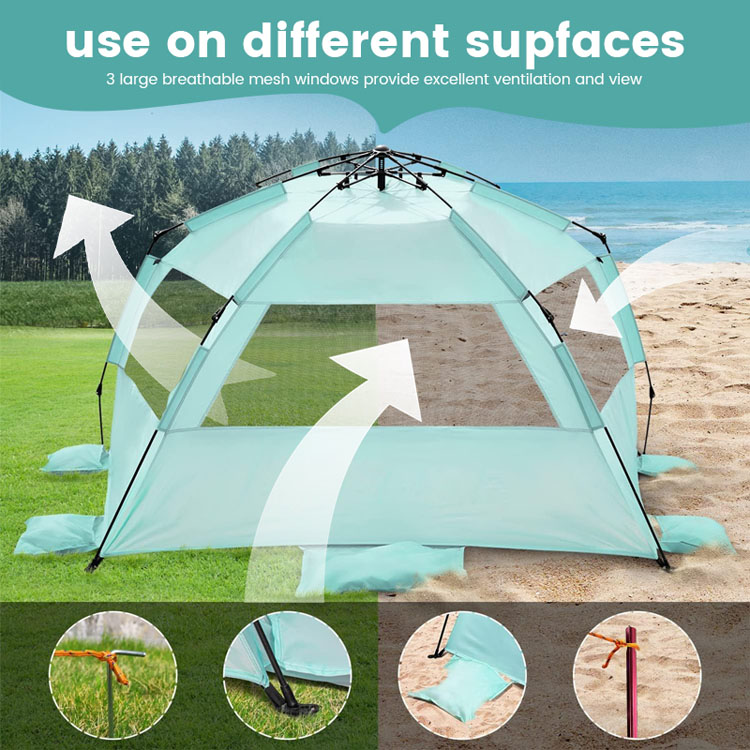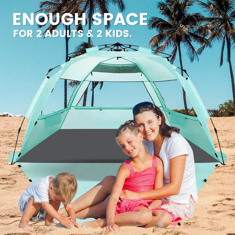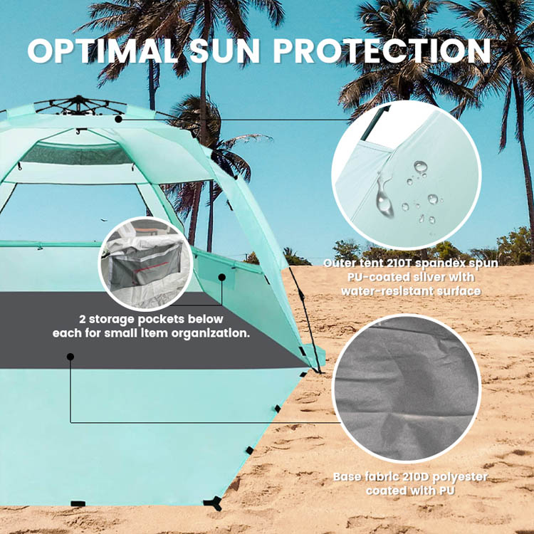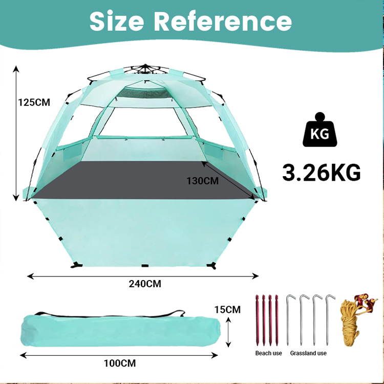 Tenda de praia com proteção solar ultraleve de poliéster a granel por atacado. Sua principal solução de atacado para proteção solar na praia. Esta barraca de proteção solar ultraleve de poliéster apresenta um design dobrável pop-up conveniente. Perfeito para uso em massa em praias ao ar livre, combina fácil implantação com cobertura de sombra confiável.